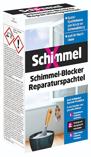 Feuchtigkeitsbeständige Spezialmasse. Durch die natürliche Alkalität der Spachtelmasse sind die gespachtelten Stellen ohne Zusatz biozider Wirkstoffe vor Schimmelbefall geschützt.